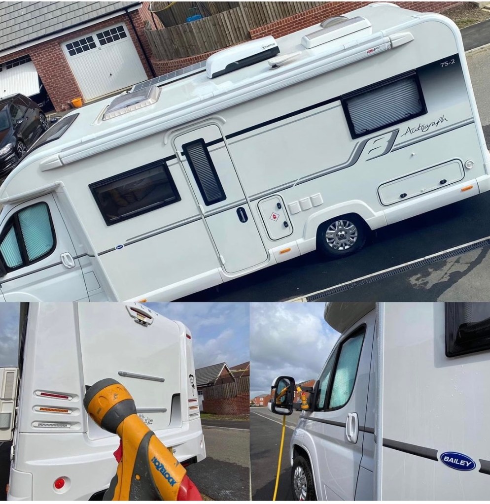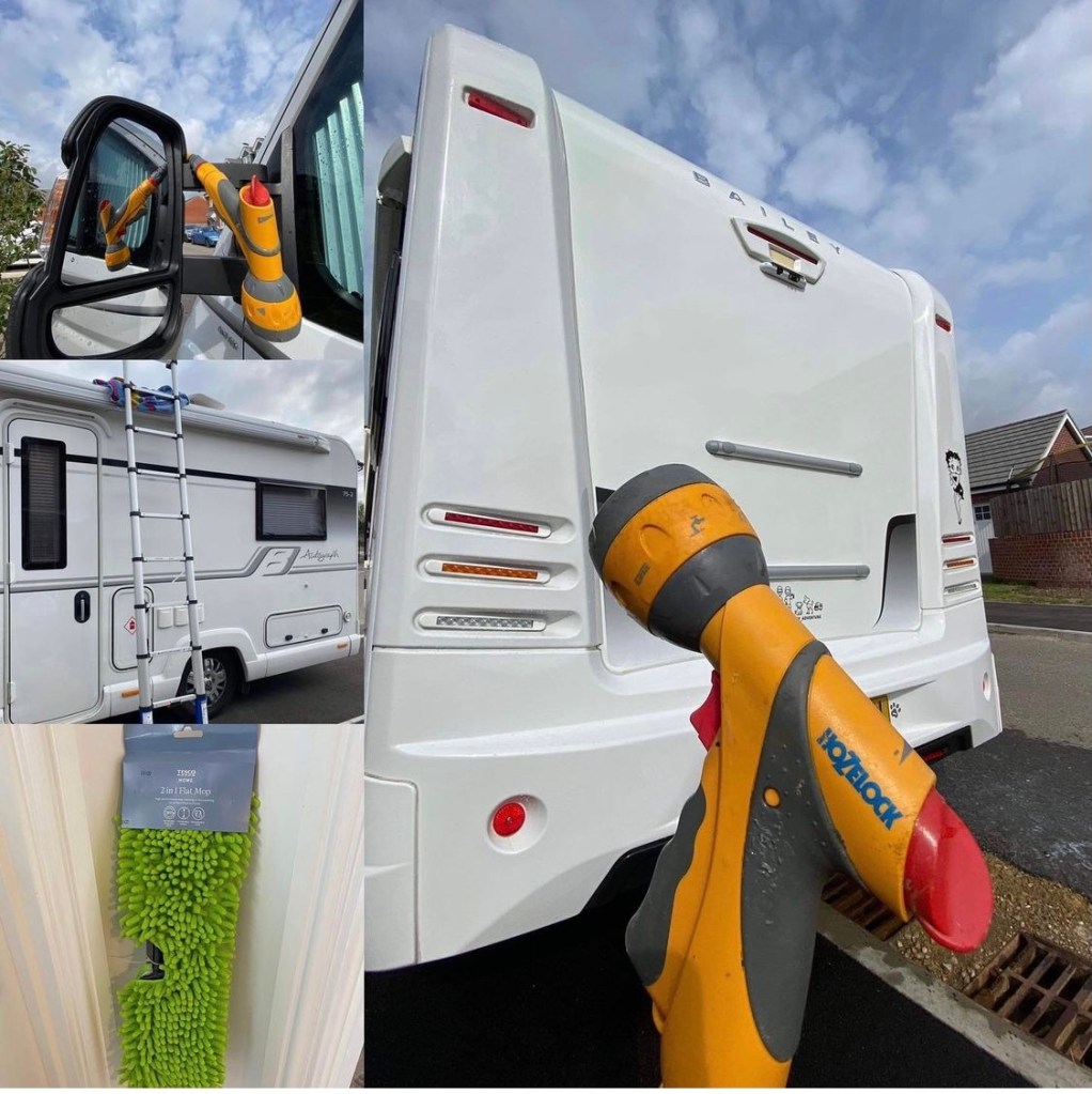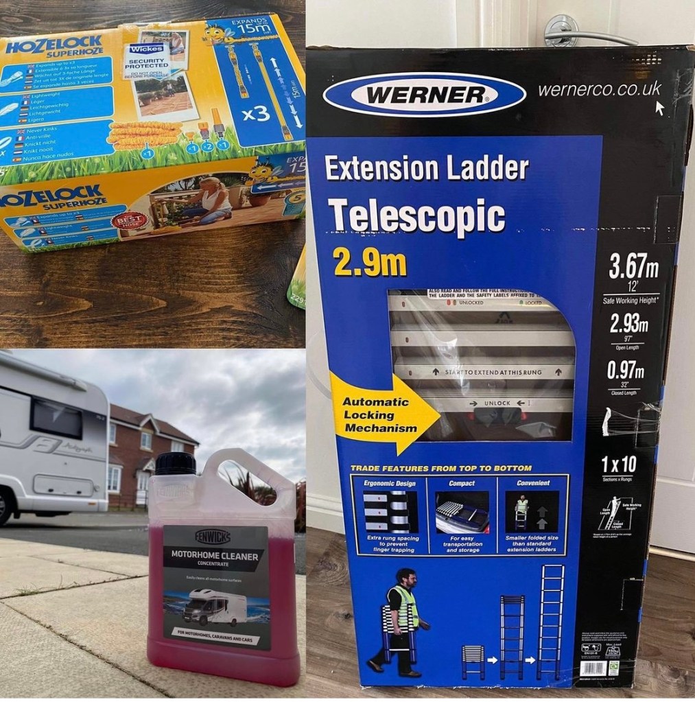 15M Expanding Hose from https://www.hozelock.com added to our existing garden hose. The ladders were a great buy from Wickes (these were on offer at just £95 when we visited) https://www.wernerco.com/uk and shall be great to throw in the boot with the hose extension to wash Betty at the storage next time eliminating the need for home trips each time. We have seen good reviews of the Fenwicks products online/in socials so have given the Motorhome Cleaner a go – https://fenwickscaravan.com/product/motorhome-cleaner/