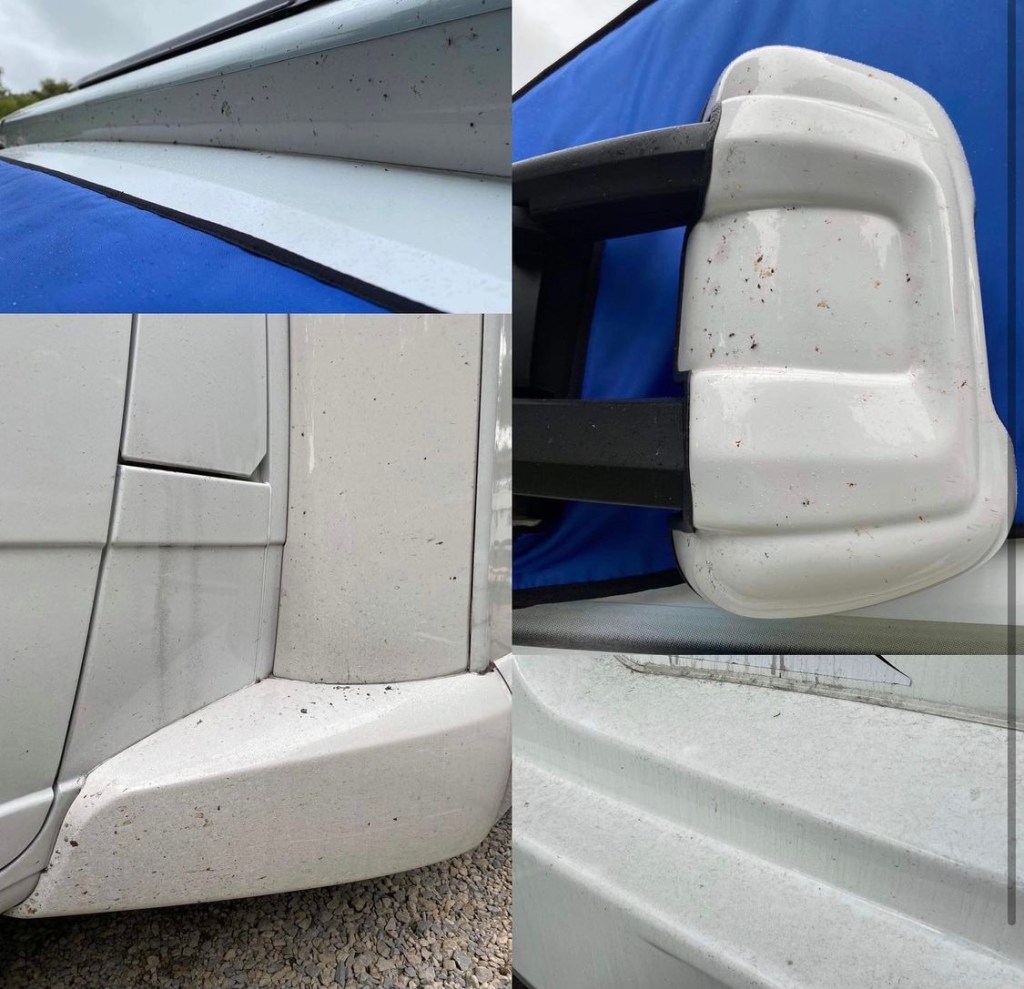 A good morning of graft has got our Betty looking spick and span! Bright white again for the next trip! Any ideas or advice on remover for the flies on a white cab and front of the roof would be welcome – as these are stubborn little buggers!