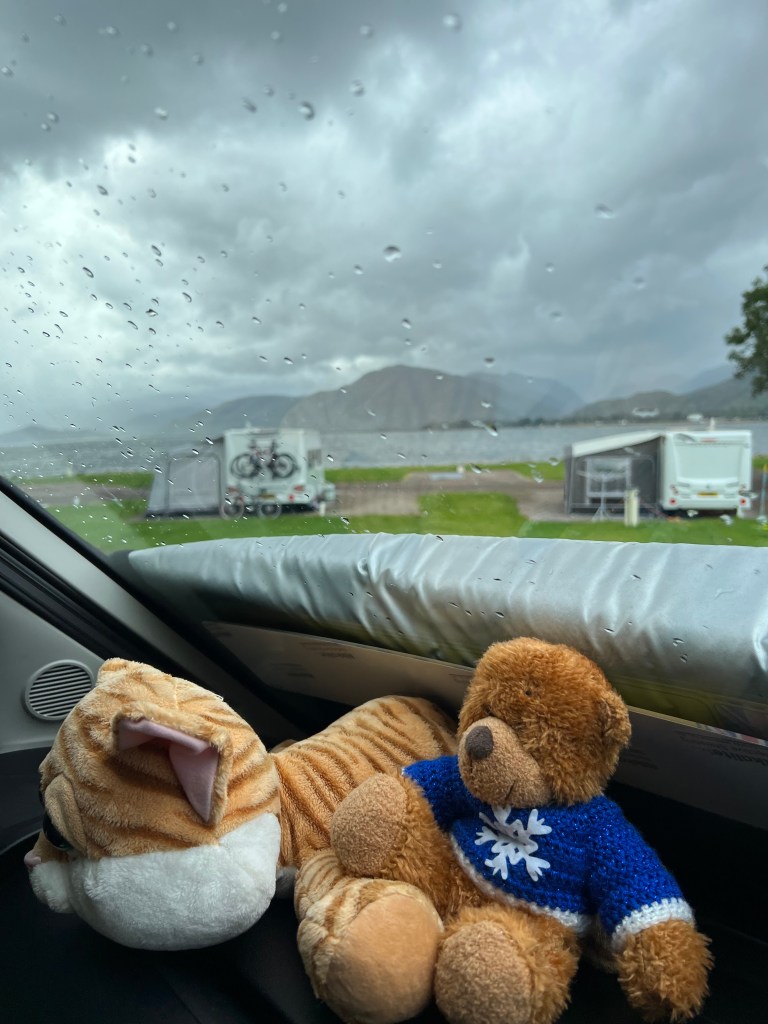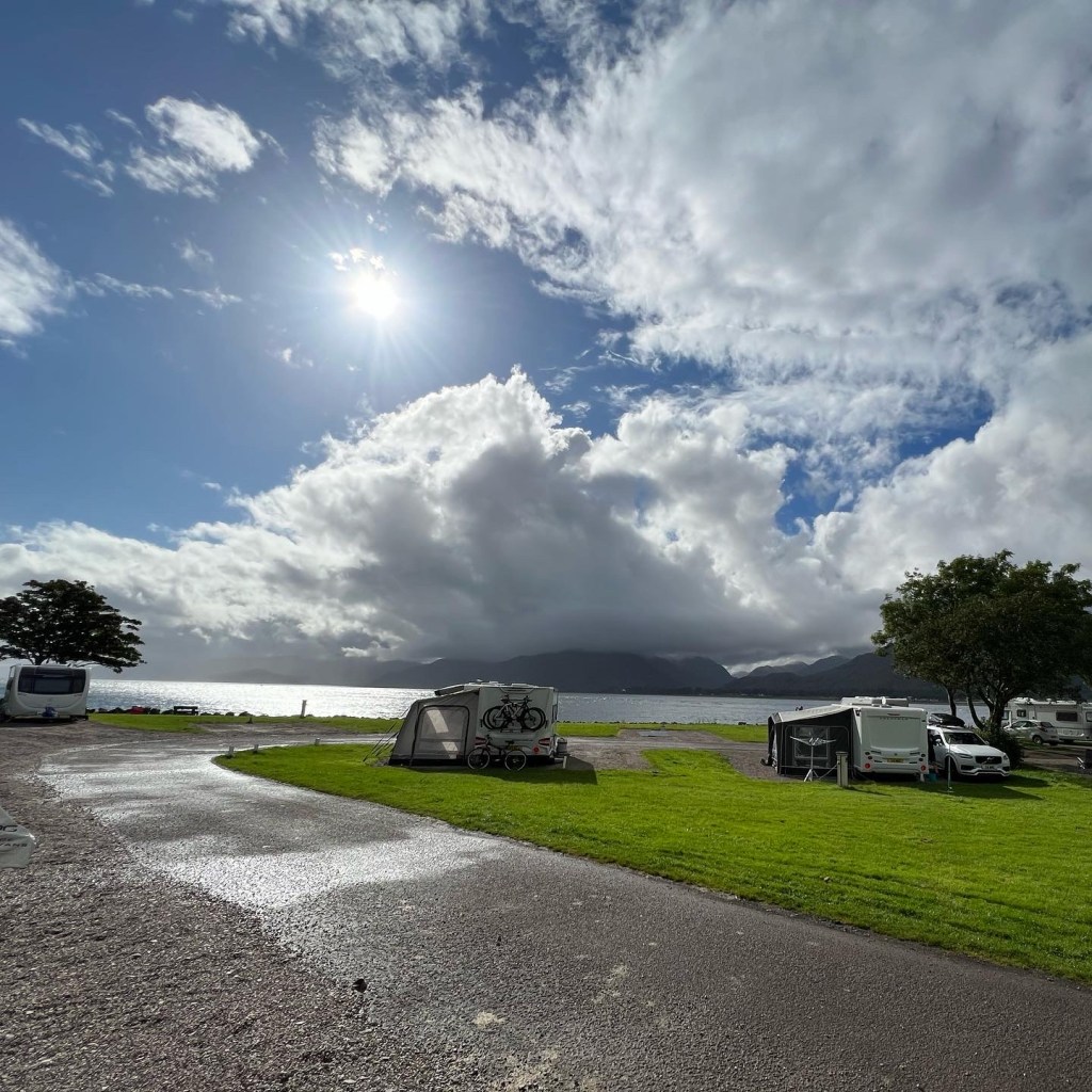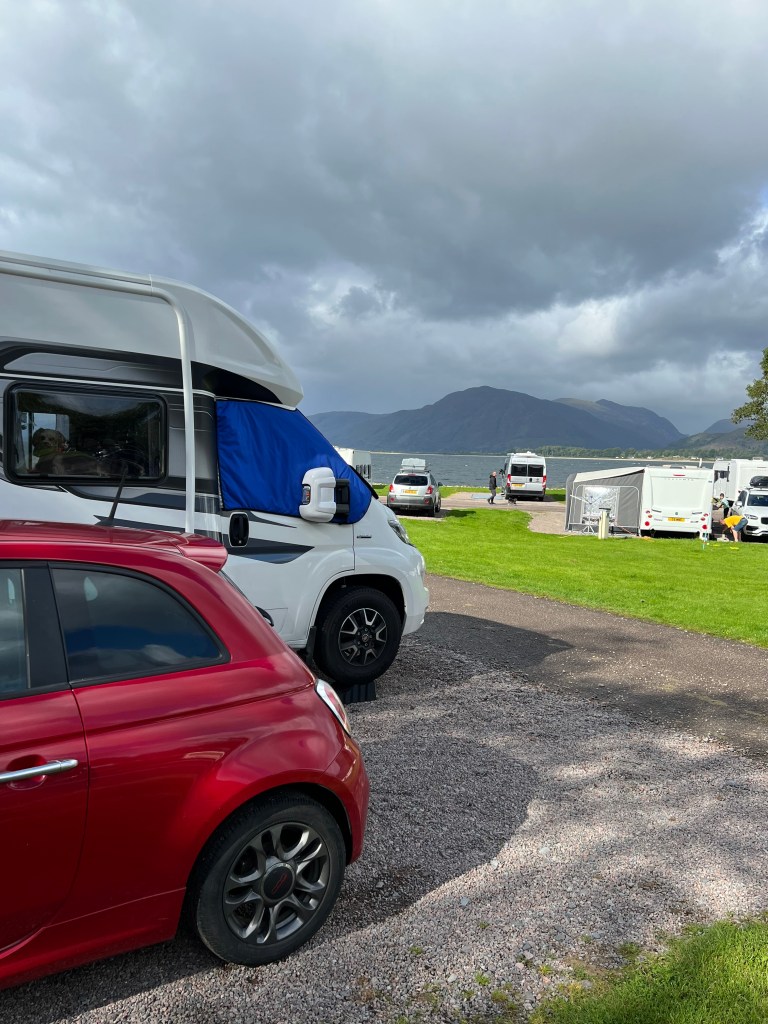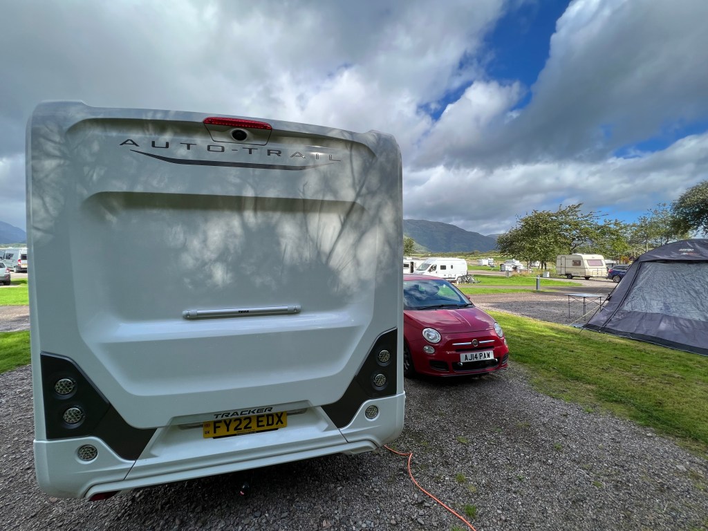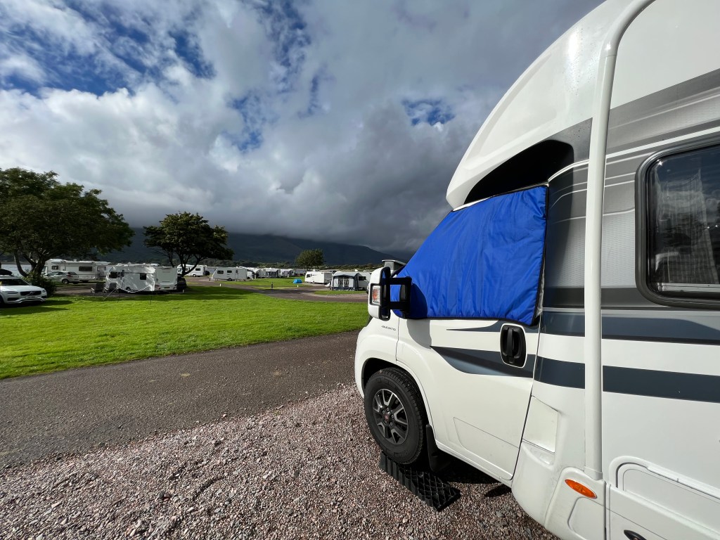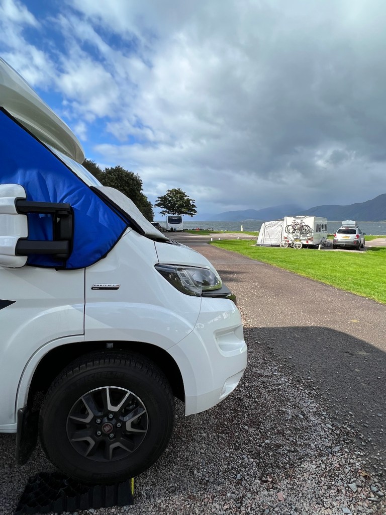 Bunree Club Site – This is our absolute favourite Scotland site – could almost be our complete new favourite had it been closer to home! Simply wow. We really liked the location and scenery/setting this site is in – whilst we did not have a non-awning pitch at the waters edge, we did have a nice elevated pitch, Pitch 18 which gave a super view out (if we were pushing the limits of the levelling wheel blocks to get level (this has cemented us getting the Milenco Quattro 3 to give some extra lift). There is a traffic light system to enter the site. when you leave the main road. Well located for Fort William, Glen Coe and a short drive from a number of interesting locations such as the Harry Potter rail bridge!